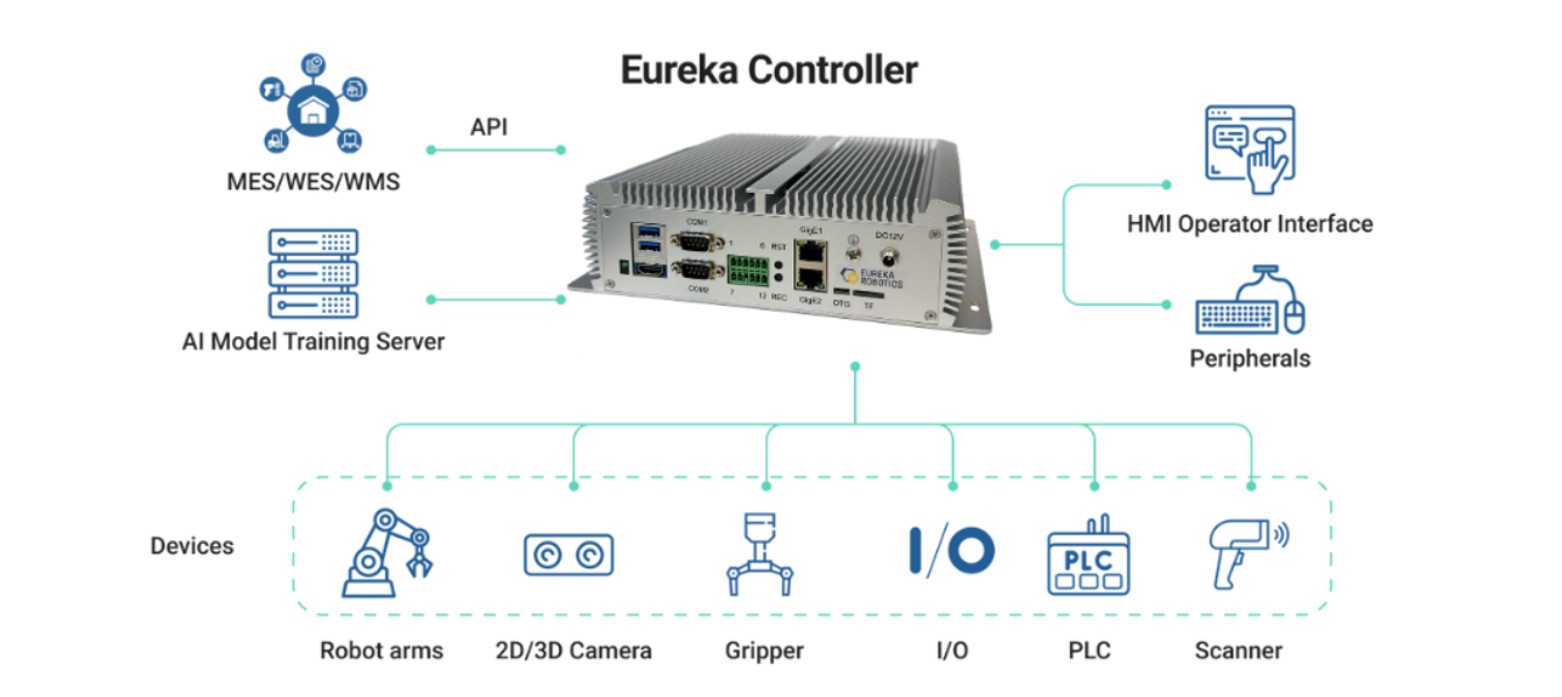 The Eureka Controller seamlessly connects with robot arms, cameras, sensors, PLCs, and other industrial devices—coordinating them into powerful Robotics and AI vision systems. Designed for engineers of all backgrounds, not just robotics experts, the Eureka Controller makes it easy to develop, deploy, and maintain High Accuracy – High Agility (HA-HA) applications with speed and confidence.